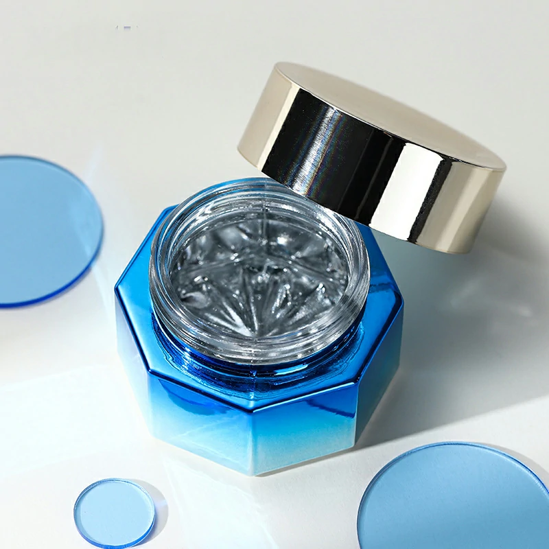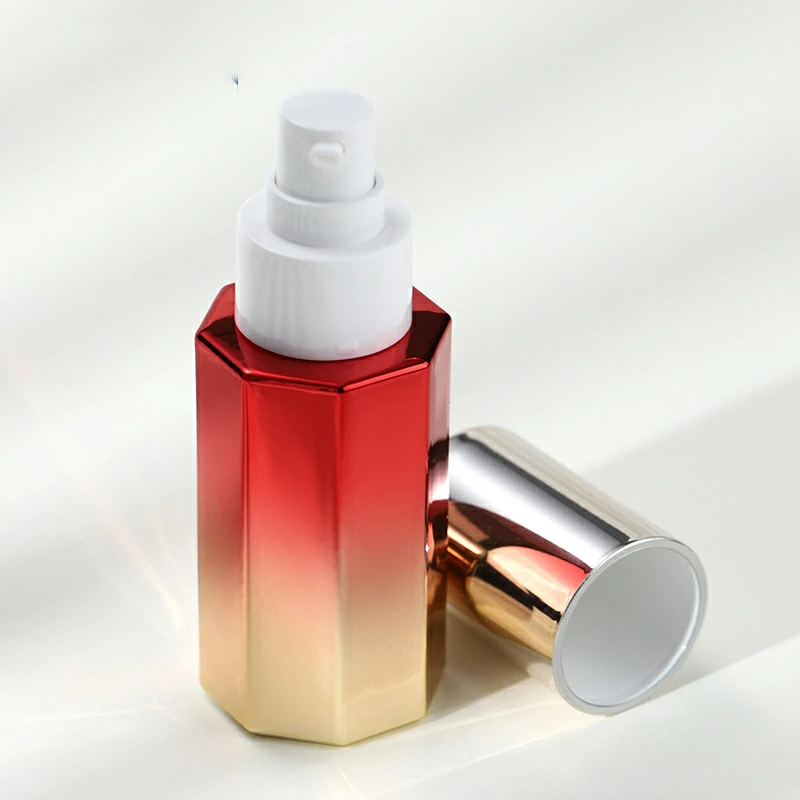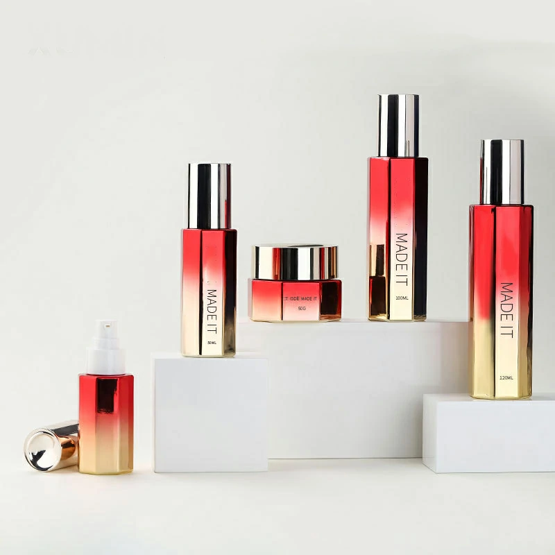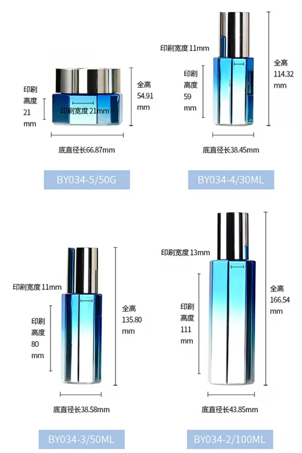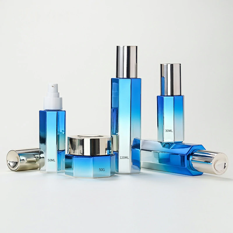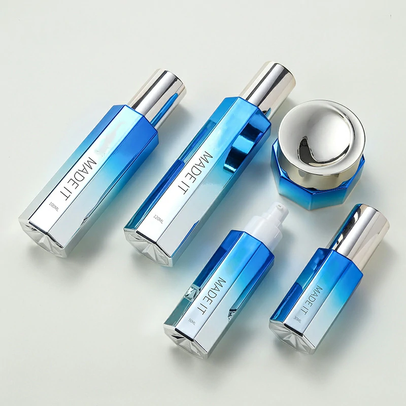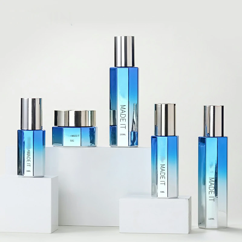 50g gradient red glass cream bottle, electroplating cap set bottle, 100g blue press bottle, 30g irregular lotion bottle