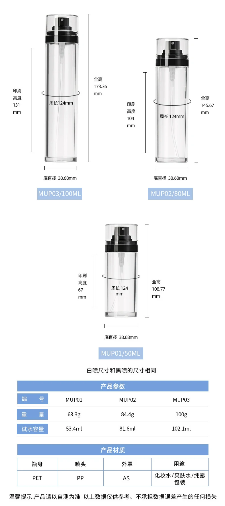 50ml injection-molded PET spray bottle, 100ml thick-walled transparent spray bottle, setting spray dispensing bottle, eco-friendly