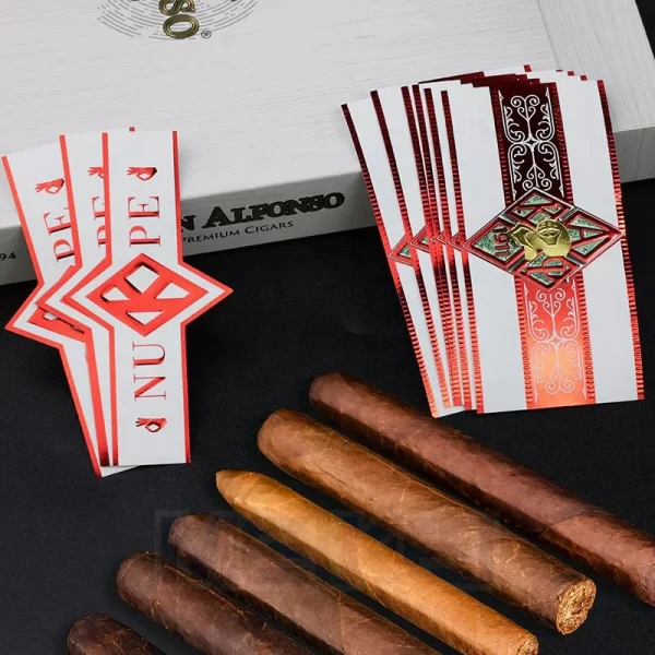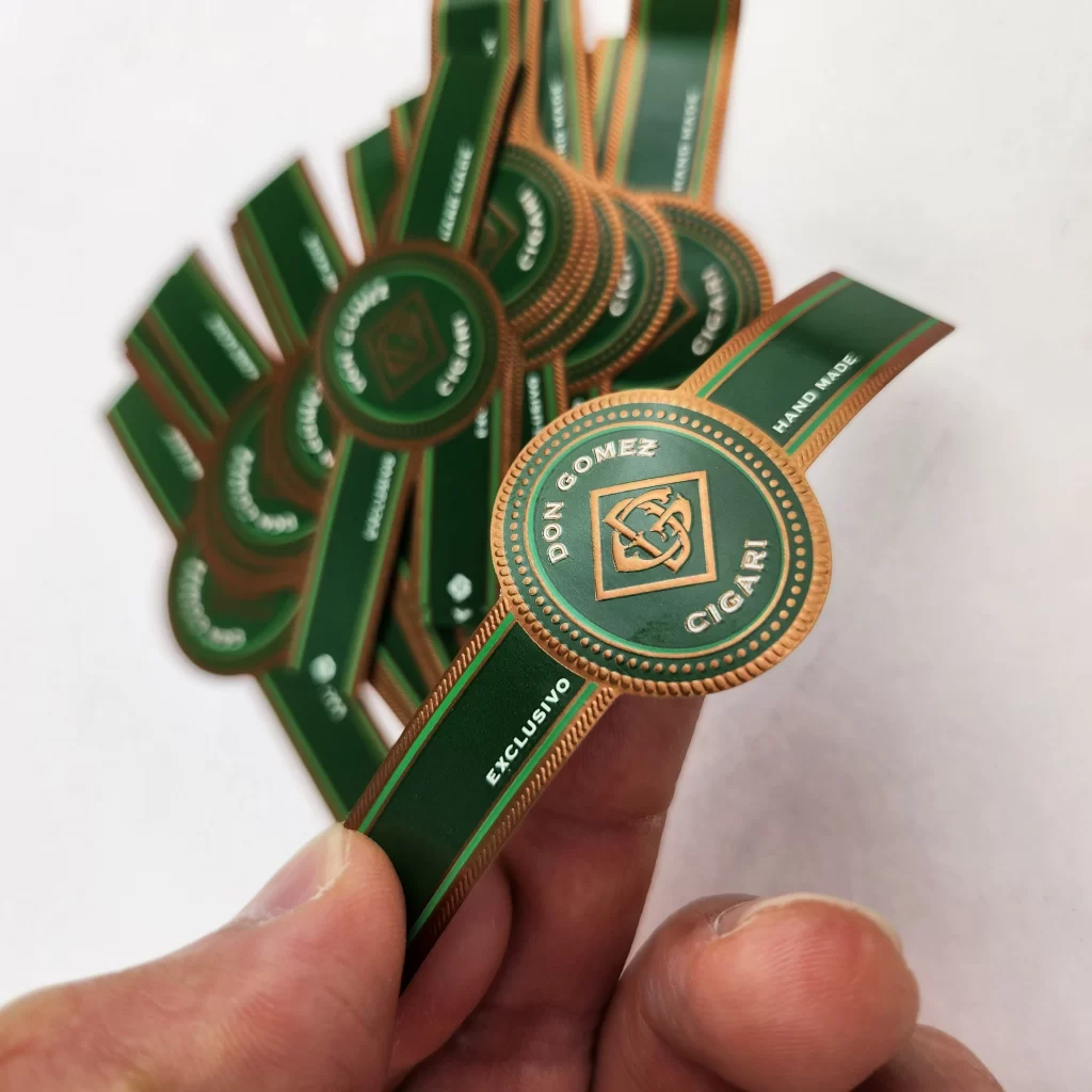 Cigar band is a loop made of paper or foil fitted around the body of a cigar to denote its brand or variety.As a 10 years experiences factory in customization of high-end label and sticker and paper card, we have lots of outstanding technicians with many years of experience and perfect production systems. We are dedicated to production process of cigar bands,wine stickers,beer stickers ,barcode and other perfect sticker and paper card. For serving efficiently, we provide customers with first-class products as well as reliable after-sales services, technical support and comprehensive printing solutions according to your project needs.