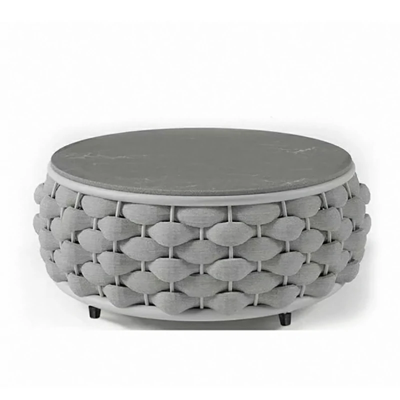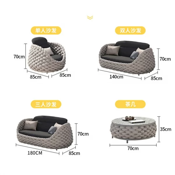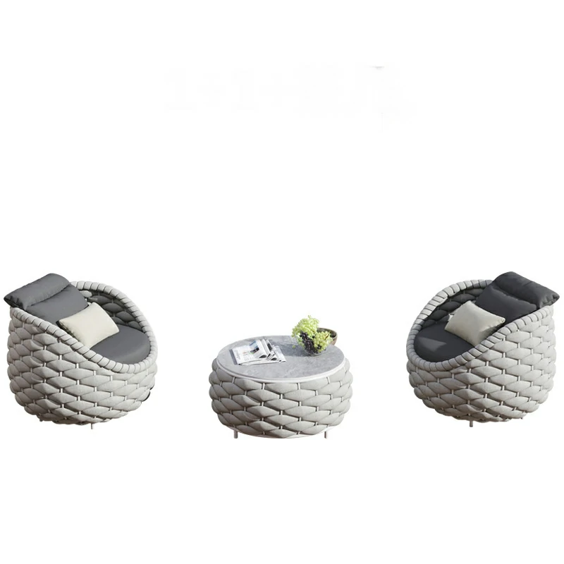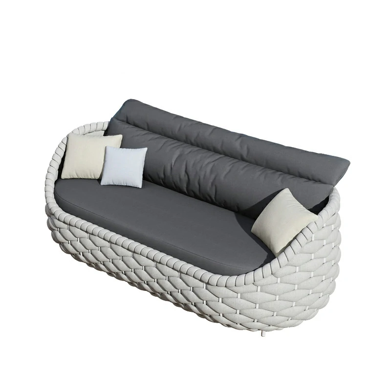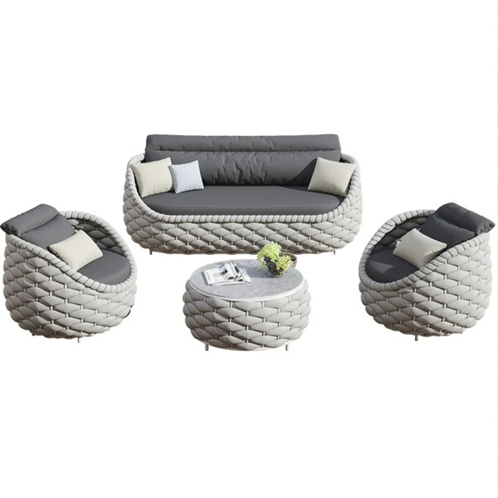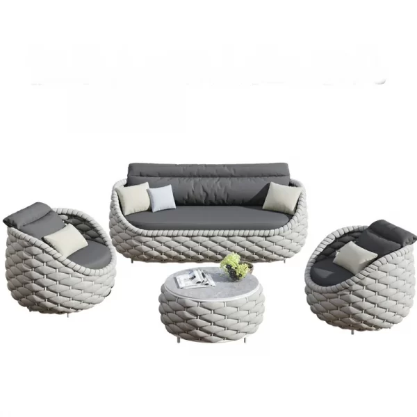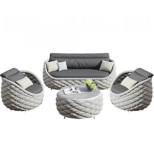 The backrests and armrests showcase precision-crafted grid-pattern rope weaving, offering both visual texture and structural flexibility for comfortable outdoor lounging.