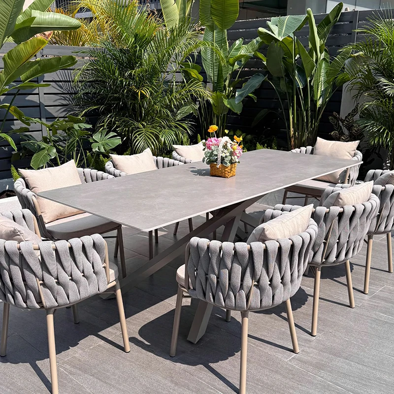 The backrests and armrests showcase precision-crafted grid-pattern rope weaving, offering both visual texture and structural flexibility for comfortable outdoor lounging.
